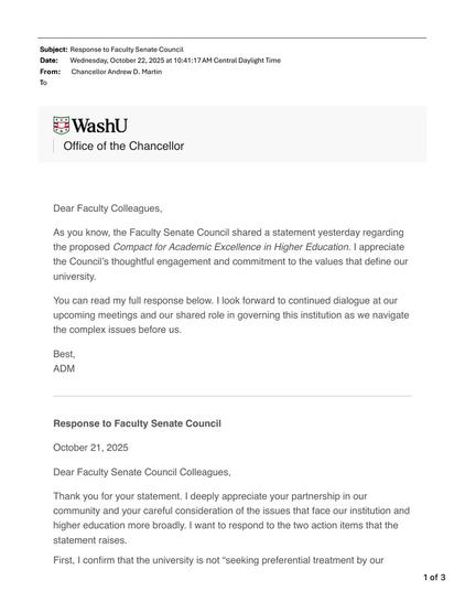 Update. Like Vanderbilt (above), #WashingtonU has not not accepted or rejected the Trump compact. But also like Vanderbilt, its Chancellor, Andrew Martin, just released a vague and inconclusive statement on where it stands (Oct 20).